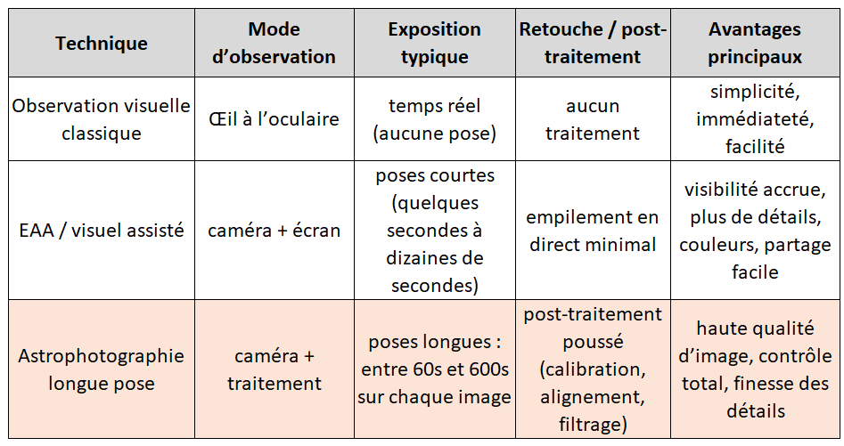 - Patience et persévérance (conditions météo, pollution lumineuse et seeing (transparence du ciel)).
